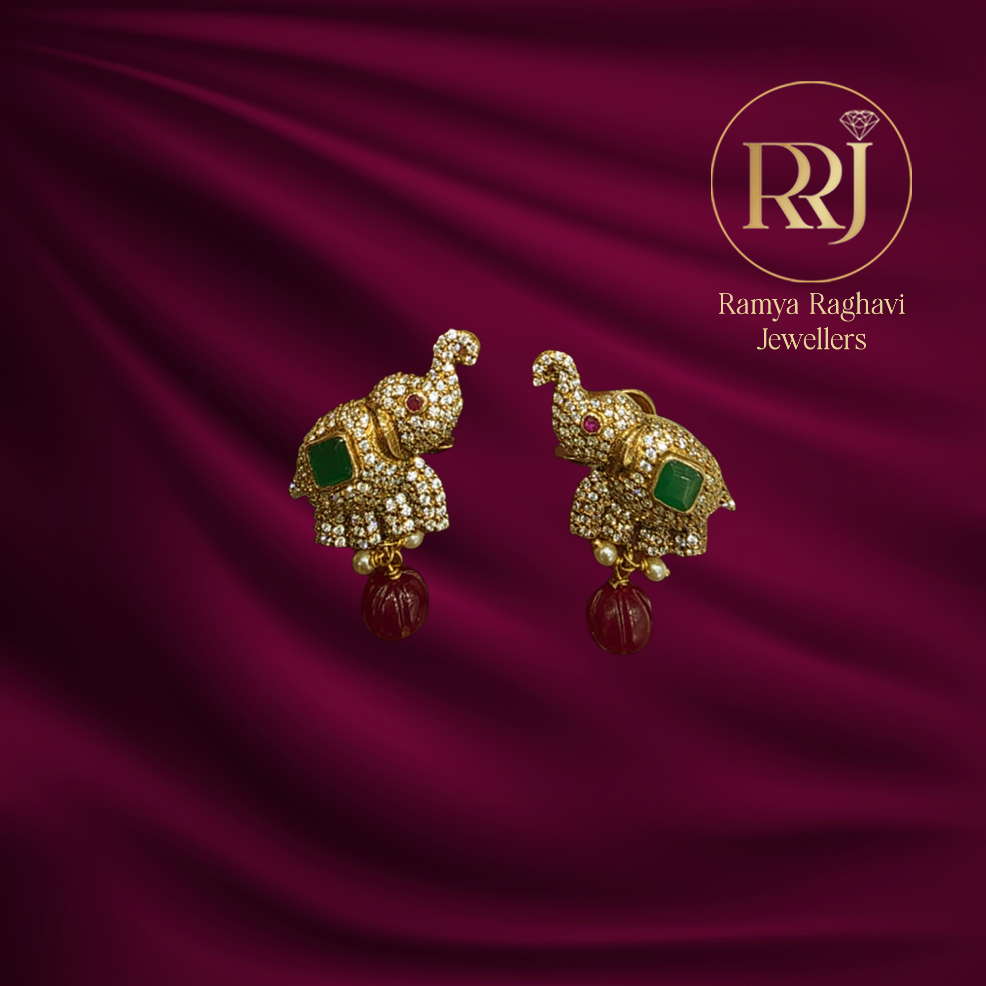 These magnificent Diamond Emerald Elephant Gold Earrings are a stunning tribute to strength and prosperity, featuring intricate gold elephants embellished with dazzling diamonds and vibrant emeralds.
