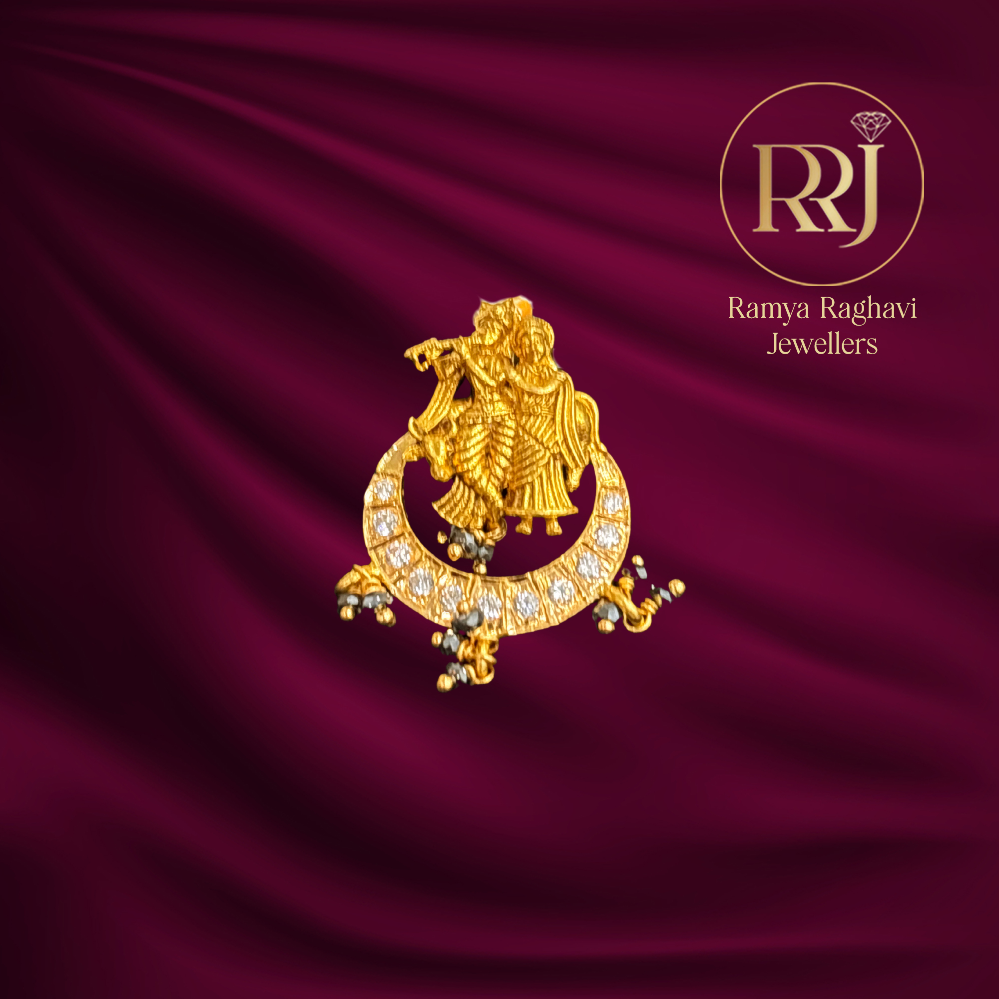 This beautiful Radha Krishna Crescent Gold Pendant is a timeless symbol of eternal love, depicting the divine couple elegantly set within a sparkling crescent moon.